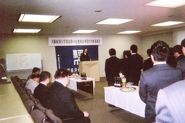柔道部OB会 平成25年3月20日(祝)、午後0時30分から、大阪経済大学同窓会館7階の同窓会ホールにおいて、吉田文雄相談役(24回卒)、逸見 学相談役(26回卒)をはじめOB、来賓、現役学生60名が集い、平成25年度の柔道部OB会総会・懇親会並びに現役学生歓送迎会を開催した。 司会の石橋和幸事務局長(29回卒)が総会の開会宣言、OB会員の物故者に対し黙とうをささげたあと、下垣恒彦会長(36回卒)から開会の挨拶とともに、総会議事に入る前、3期9年を務めた会長職を勇退したい、と述べた。 会長勇退に関し審議した結果、まず、会長立候補者の有無を確認したが申し出がなかったため、会長選挙を行うことを承認、選挙の結果、植村亮介君(41回卒)を次期会長に選任した。植村新会長から、下垣前会長の「威風堂々」とした振る舞いを継承しつつ、大阪経済大学の「つながる力、No.1」をモットーに、OB相互の親睦を深めるとともに柔道部の発展に微力ながら貢献したい、と就任あいさつがあり総会議事に入った。 議事は、24年度事業報告、会計報告、監査報告、25年度事算案、予算案について各審議をした結果、いずれも異議なく承認された。 議事終了後、柔道部の現状について安田 太監督から、これから活躍が期待できる新入生も加わりこれまで以上の戦績も期待ができる、と報告があった後、内田 正副会長の閉会の辞をもって、総会は終了した。 引き続き、OB懇親会並びに現役学生歓送迎会に入り、大橋部長、西岡名誉師範、有川師範、竹中同窓会事務局長から、卒業する中井、高月、柳川、植松、細川の5名と藤田、椹木、浅井、中川の4名の新入生へ、これからの活躍・健闘を祈念するというお言葉をいただいた。 卒業していく学生からは、社会に出ても今まで培ってきた経大魂を発揮して邁進する決意が述べられた。また、新入生からは、一生懸命練習し、レギュラーの座をつかみたいとの抱負が述べられた。 懇親会では、乾杯を小林 肇先輩(33回)の音頭で行い、歓談後、上地賛平先輩(32回)の万歳三唱を行ったあと、学歌、逍遙歌、柔道部遠征歌を斉唱し、佐々栄治副会長(34回卒)の閉会の辞をもって無事閉会した。 事務長 尾崎義廣(38回) |