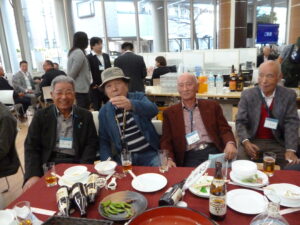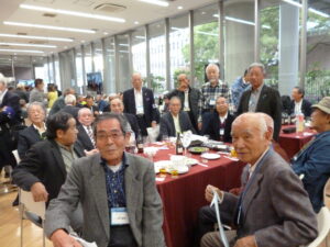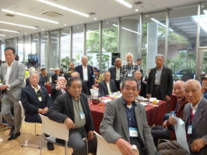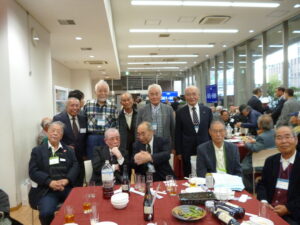 同期会は当初34人の出席でしたが、当日欠席者、式典、講演まで、懇親会途中までの退出者ありで写真撮影時は20人、学生会館1階、2階に別れて、我々32期同期会は1階で開催、ワンテーブルを囲んで初参加2人含め20人で乾杯、料理を食べながら、お酒を飲みながら1年振り、数年振りの再会を楽しみ、料理は早めに無くなりましが、美味しくお酒を飲み交わし、昔を述懐しながら多いに語らい、抽選会時間まで過ごし最後は学歌、逍遥歌を歌い、来年の再会を誓ってお開き、学び舎を後に致しました。