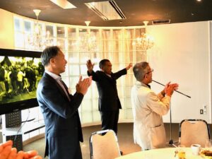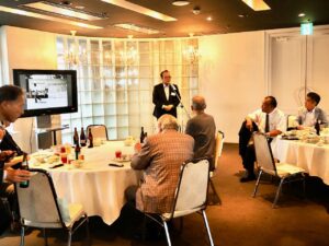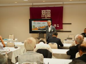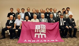 ⑤草薙理事から100周年ビジョンをふまえて「大阪経済大学の現在」と題して報告をいただきました。懇親会場では現在の大学と半世紀前の大学の様子のスライドが流されました。